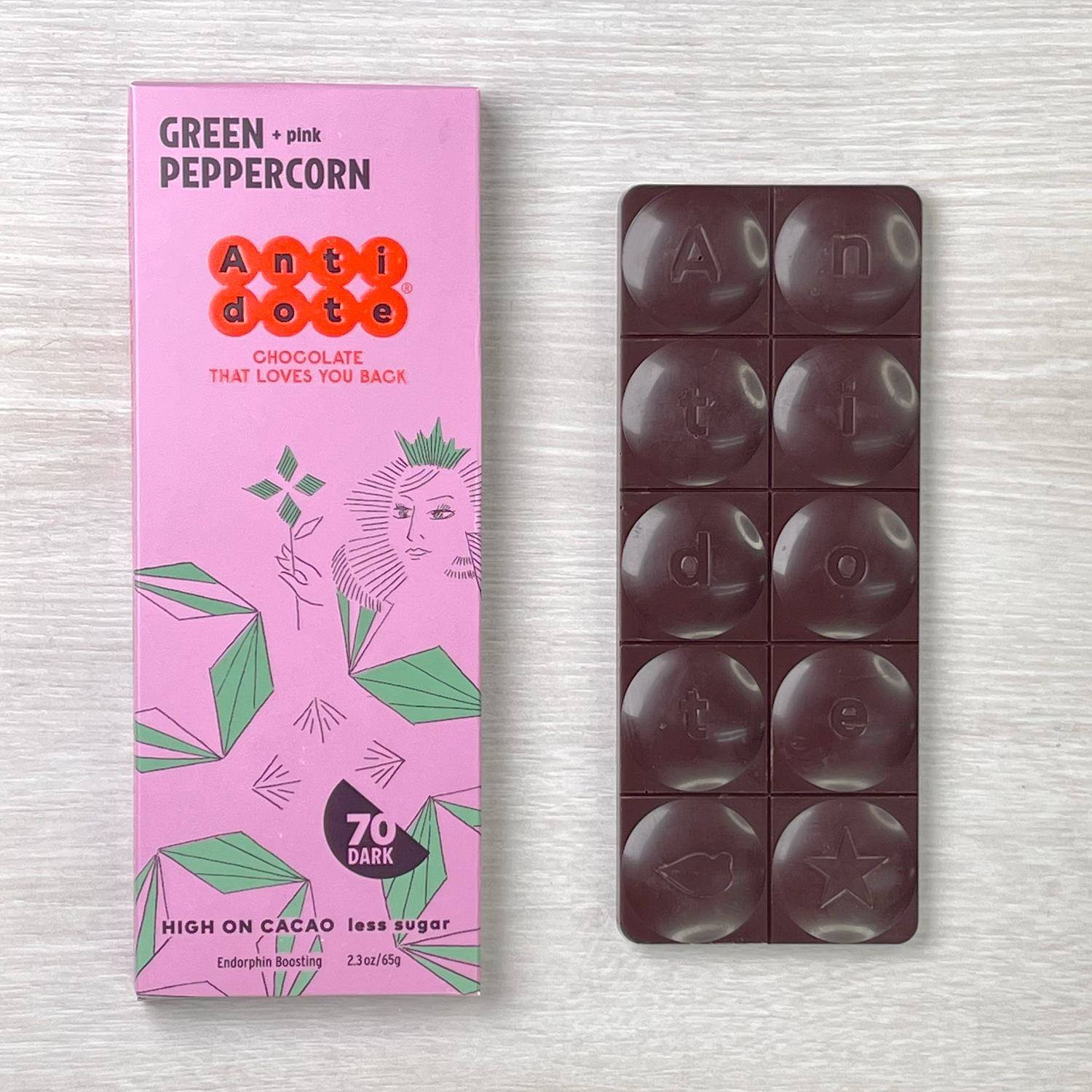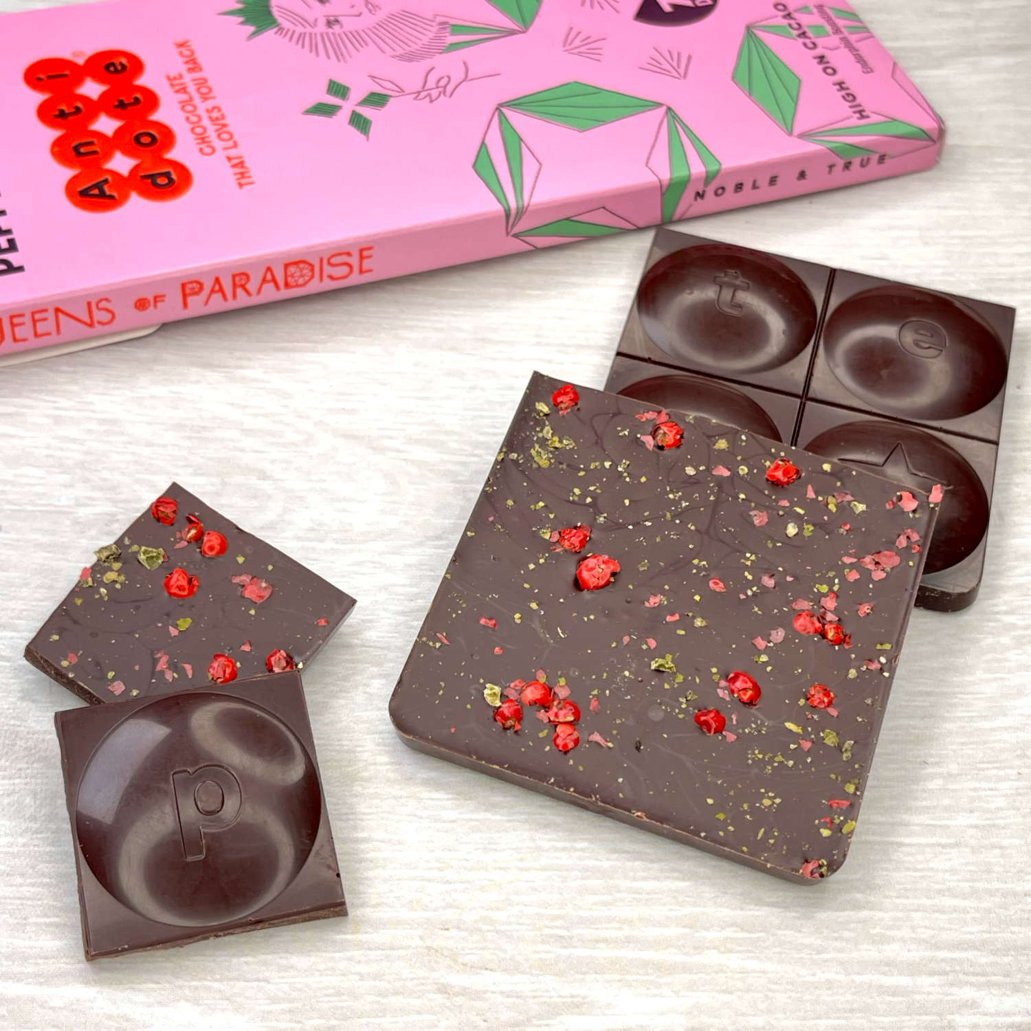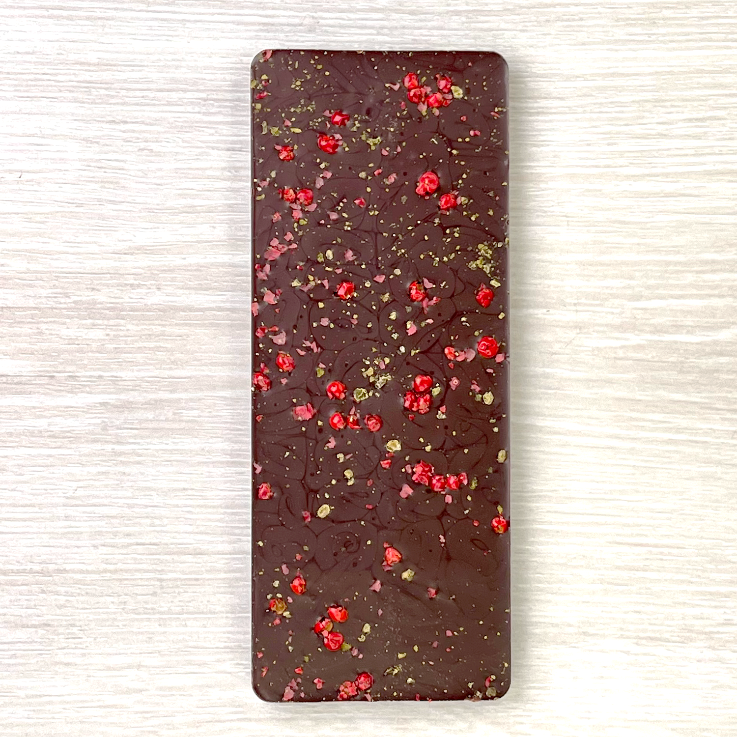 ピンクペッパーとグリーンペッパーを散りばめたカカオ分70%のダークチョコレートです。