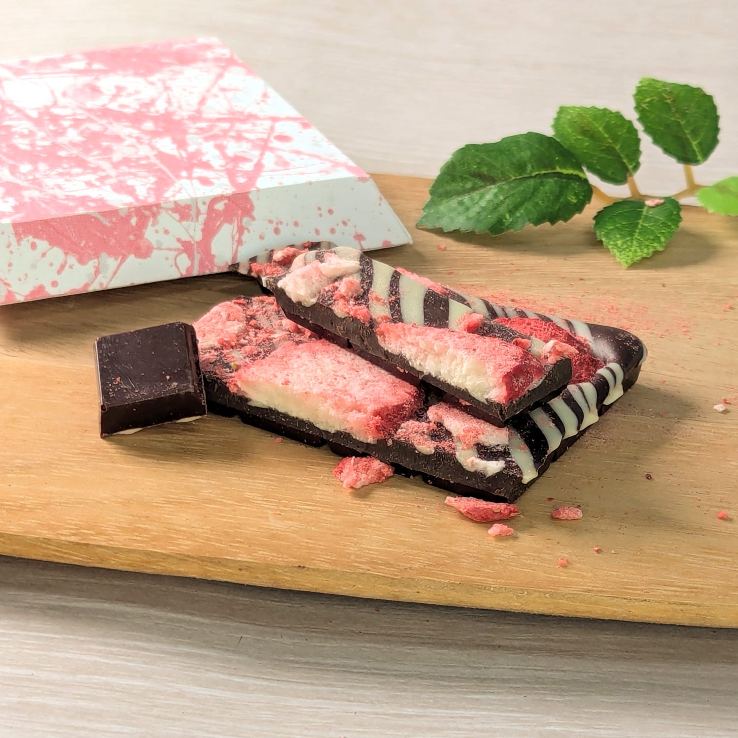 取り寄せた大粒丸ごとのフリーズドライ苺は、贅沢に厚めにカットしてチョコレートに乗せています。