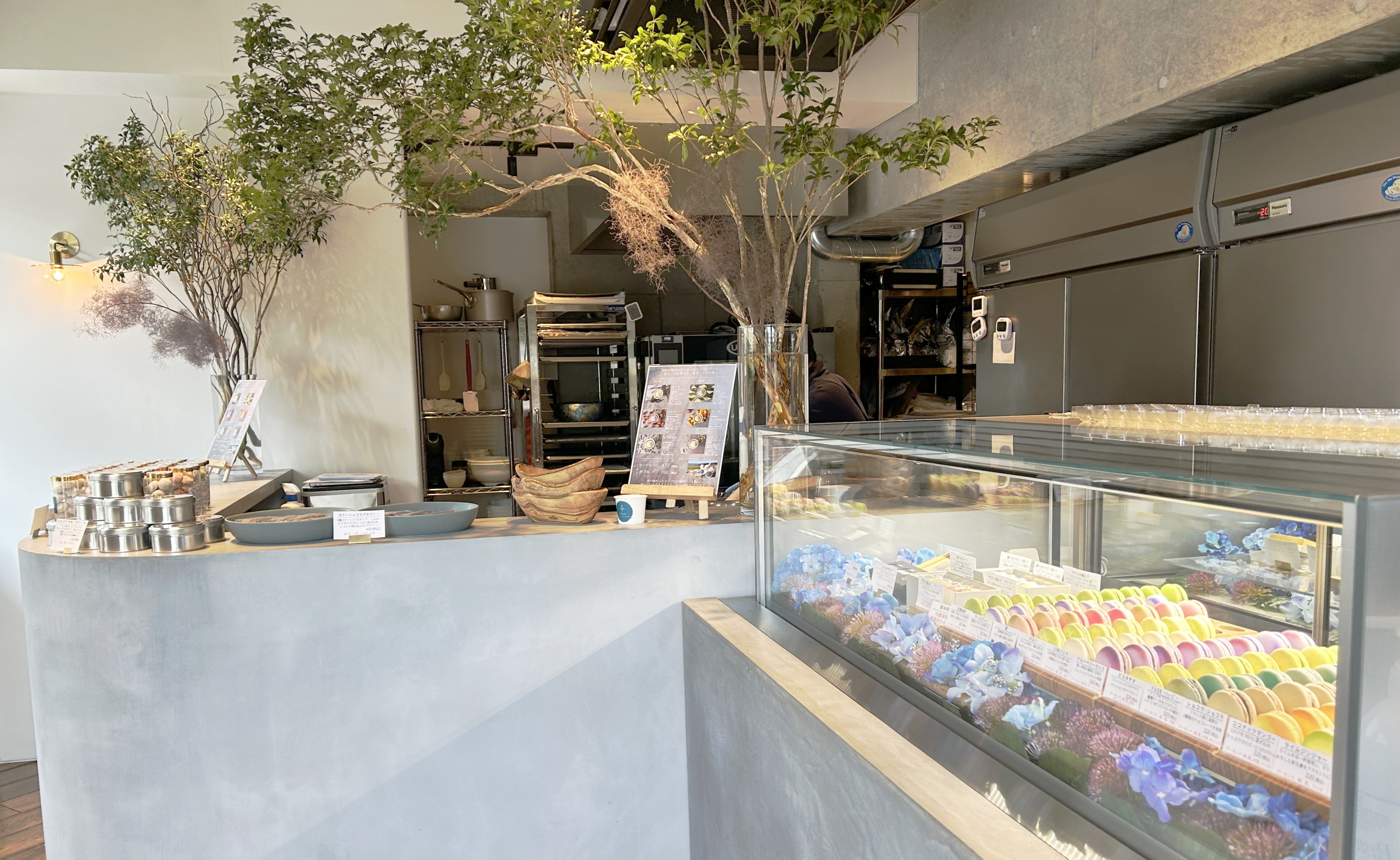 美しいマカロンが並ぶショーケースの奥には、菓子作りの現場が広がり、職人の手仕事がすぐ目の前に広がる。