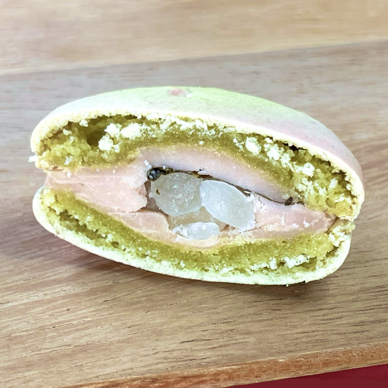 桜の葉を加えたマカロン生地に、さくら餡と生クリームを合わせたガナッシュをサンド。
