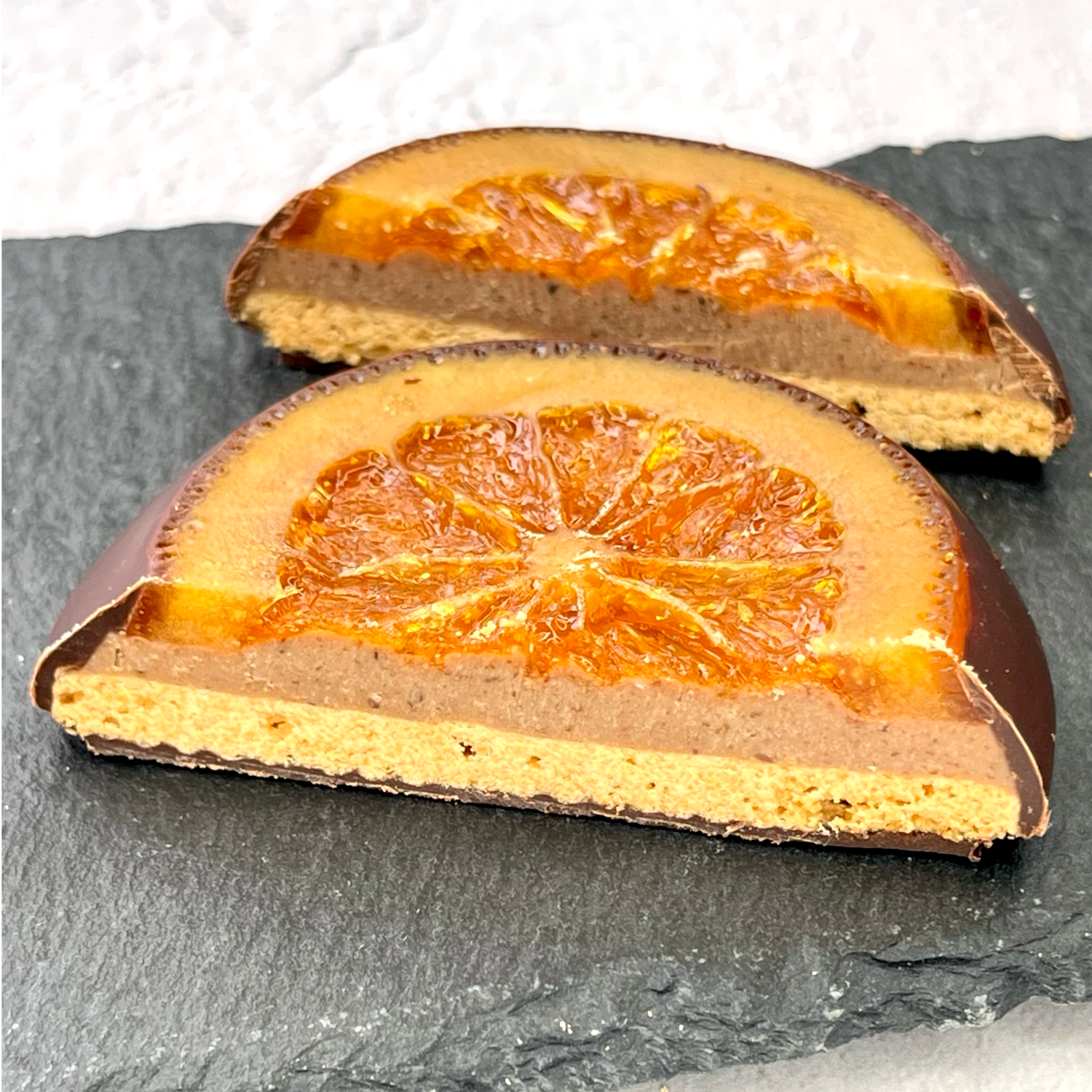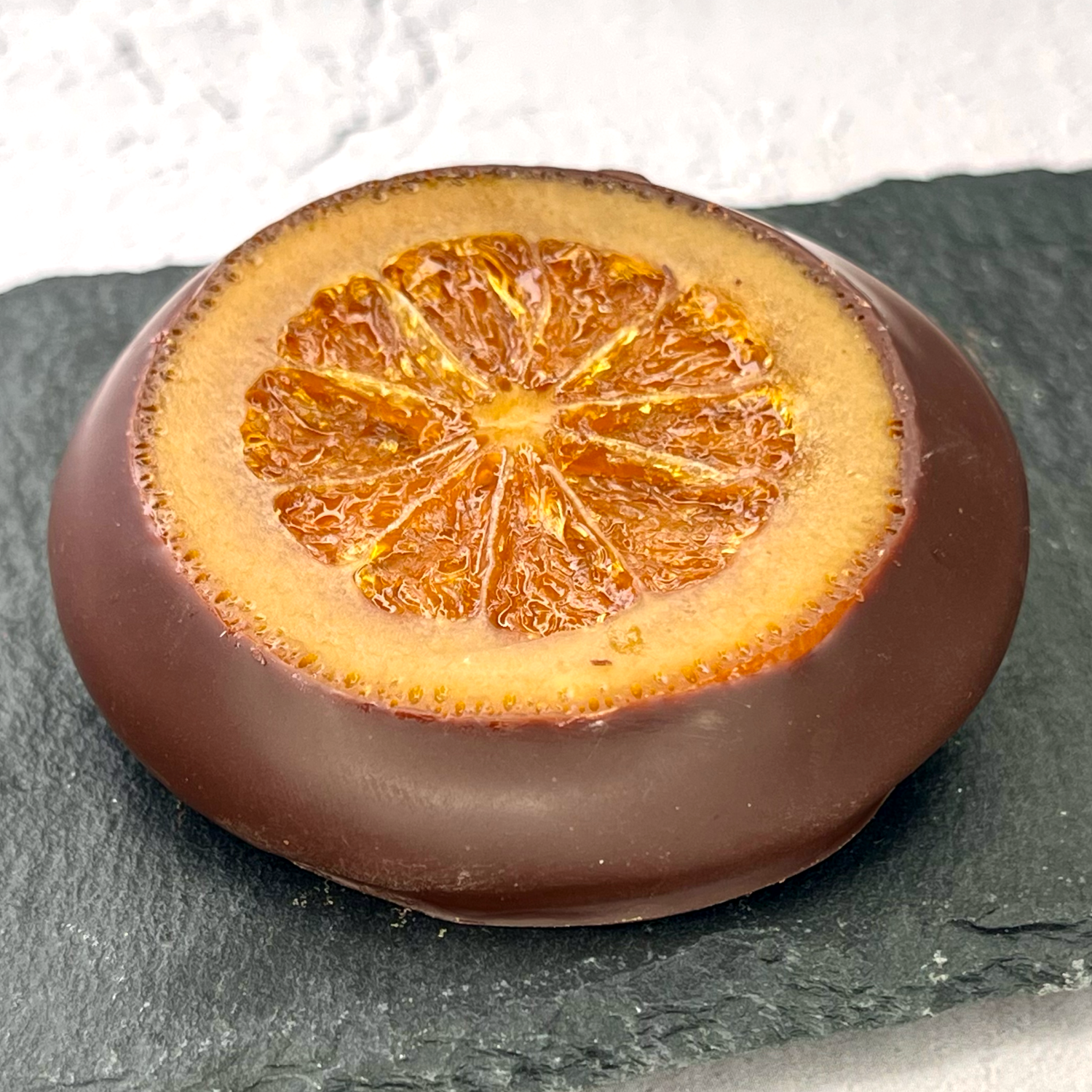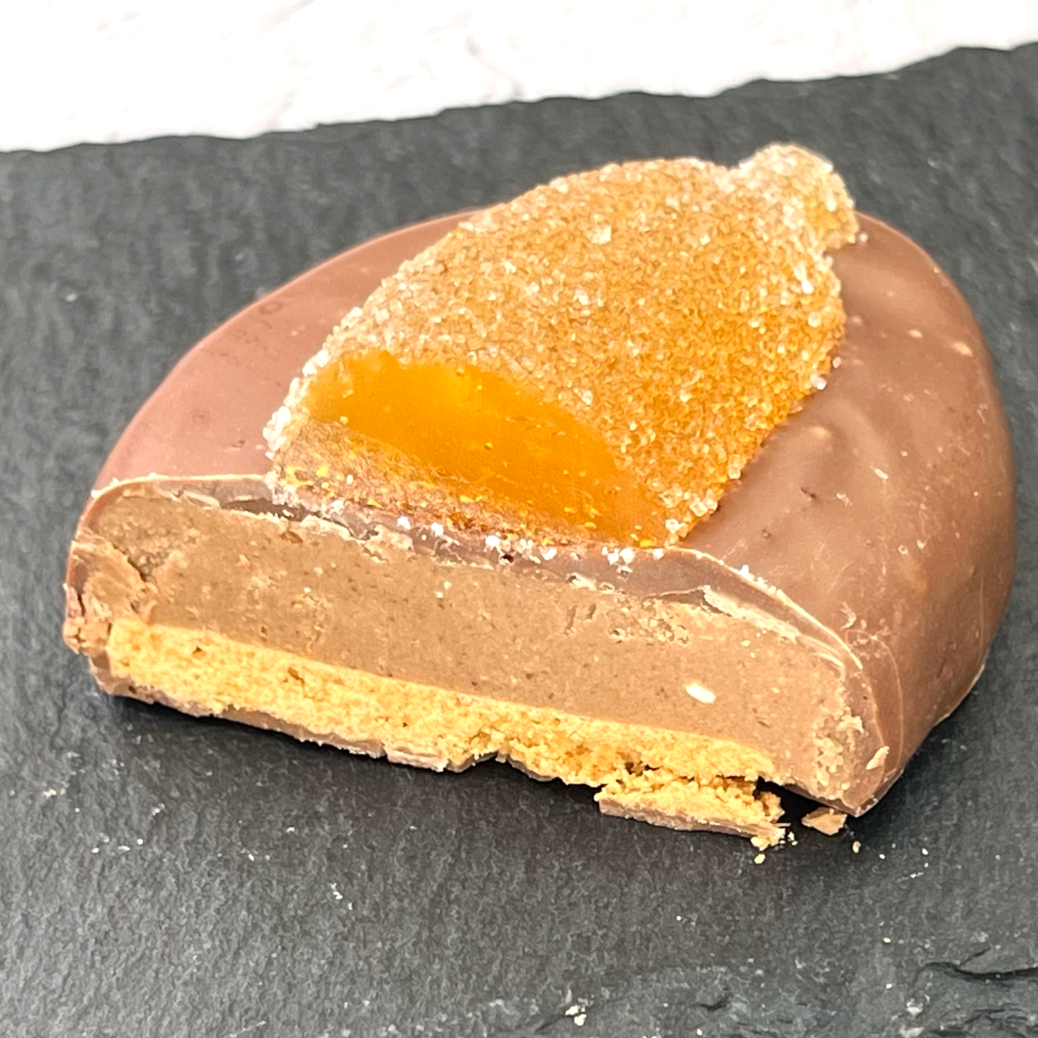 プラリネとオレンジの蜜漬けを挟み、ダークチョコレートでコーティングしています。