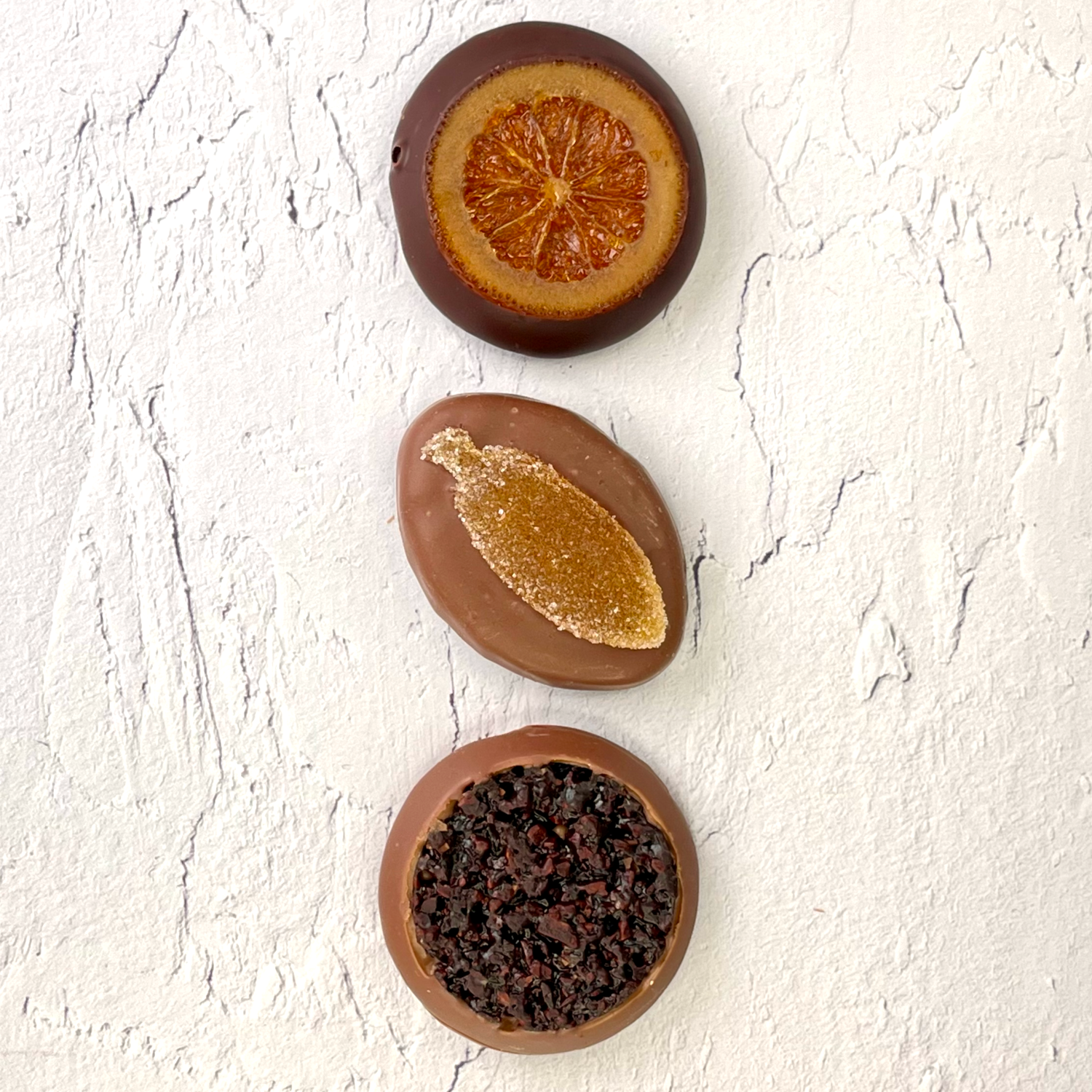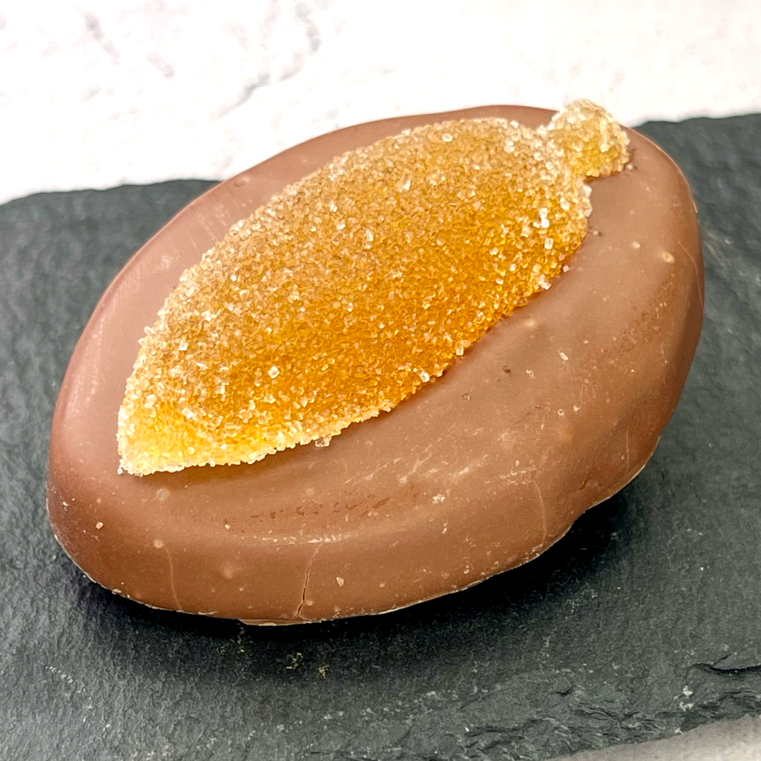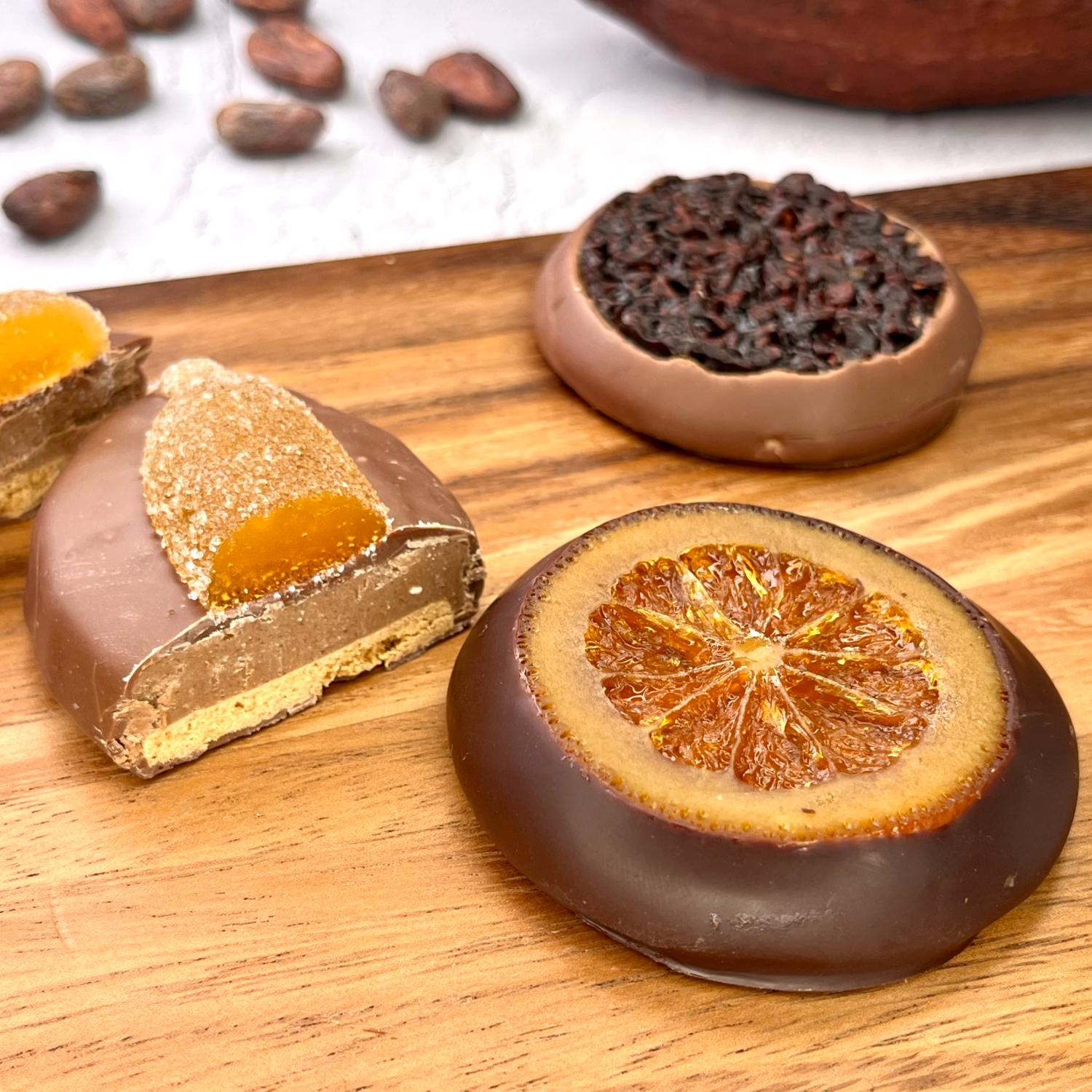 プラリネとオレンジの蜜漬けを挟み、ダークチョコレートでコーティングしています。