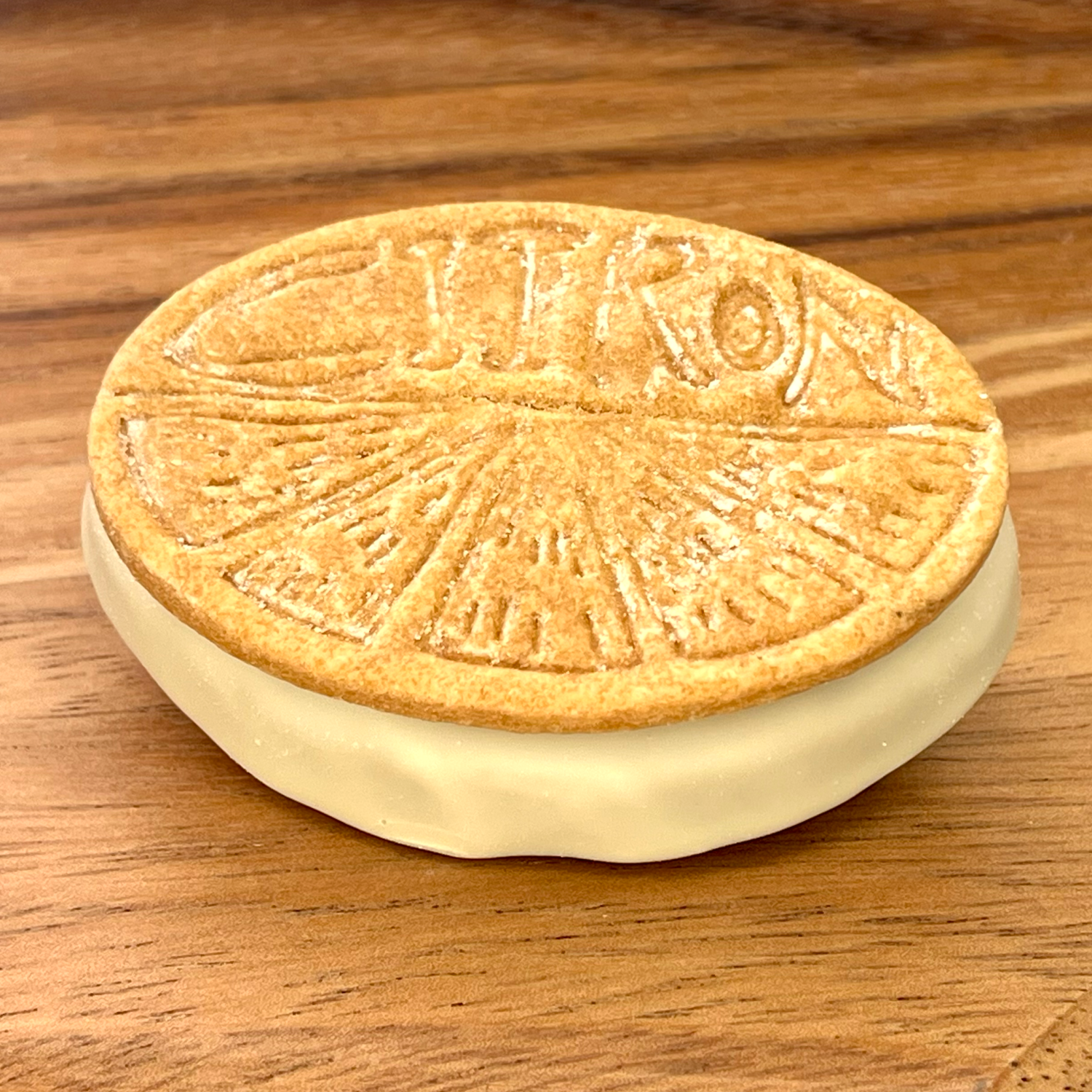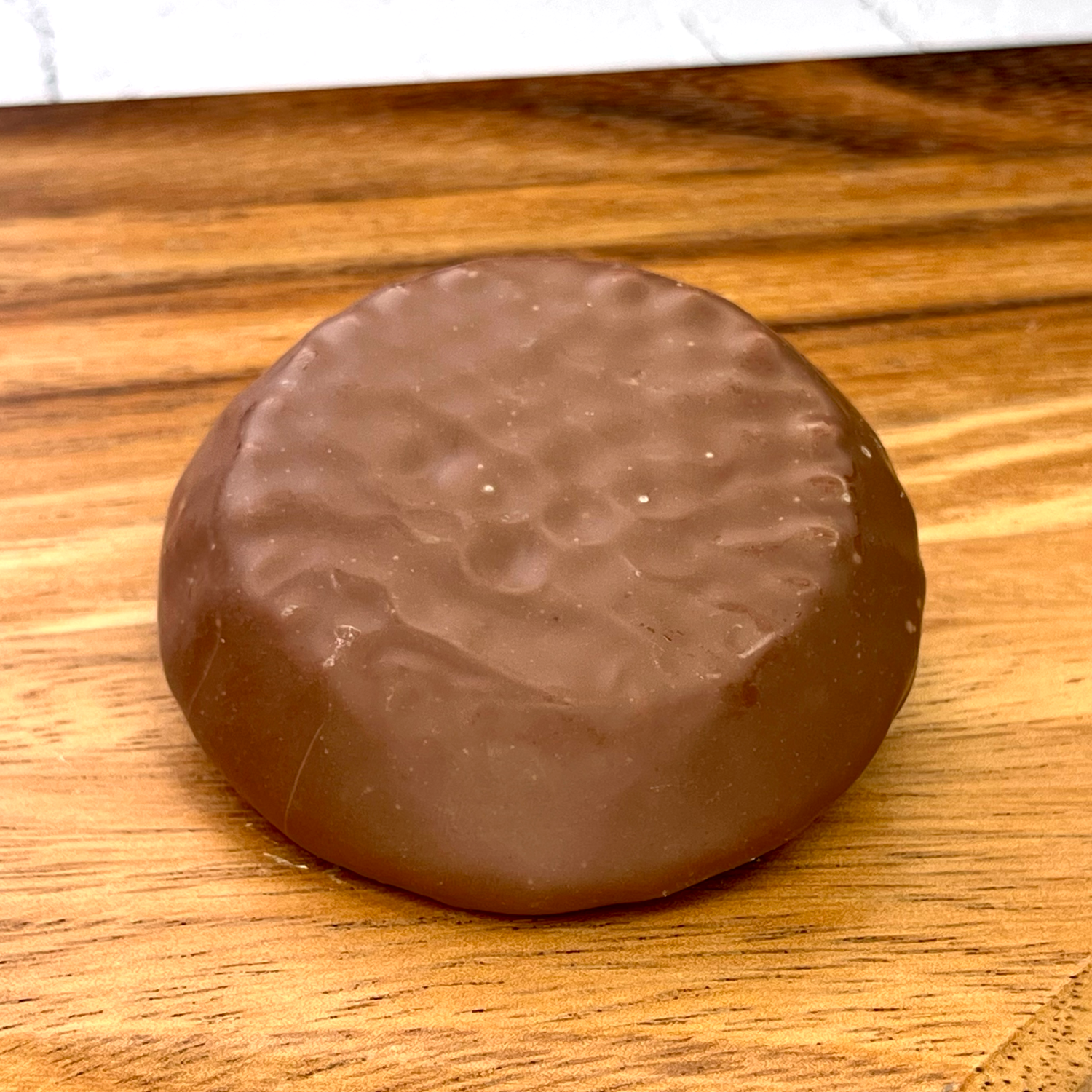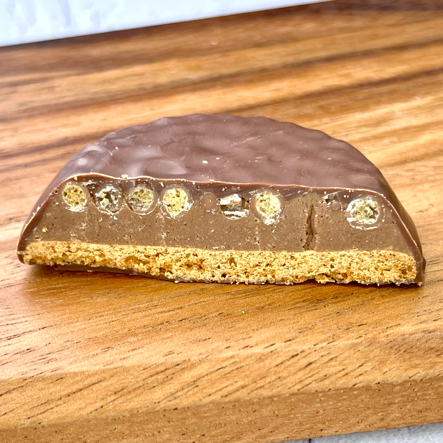 石臼で挽いたヘーゼルナッツとアーモンドを自家製のプラリネをたっぷりと挟み、ミルクチョコレートでコーティングしています。